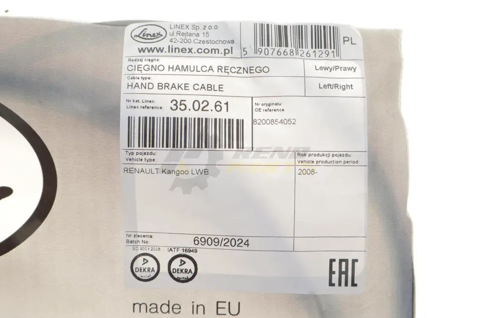 Трос стоянкового гальма 35.02.61 від виробника LINEX — це надійний компонент гальмівної системи, що відповідає за передачу зусилля від важеля до гальмівних механізмів коліс. Виготовлений з високоякісної сталі з захисним покриттям, що запобігає корозії та заклинюванню троса всередині кожуха навіть при екстремальних температурах.