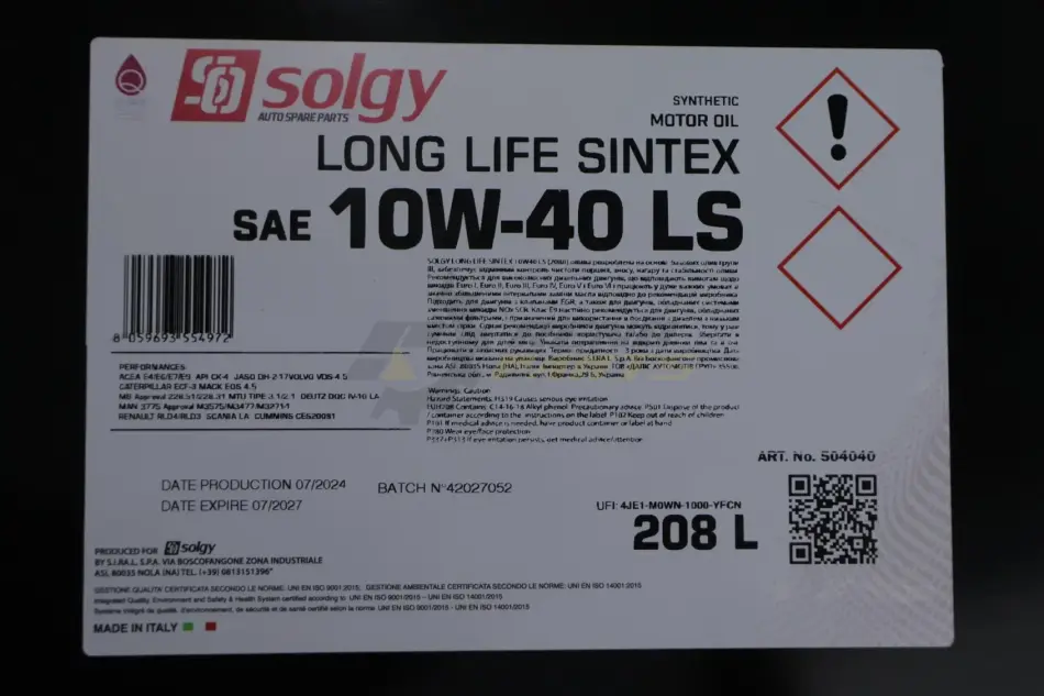 Олива моторна LONG LIFE SINTEX 10W-40 LS (208 L) Solgy 504040